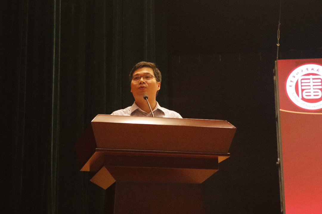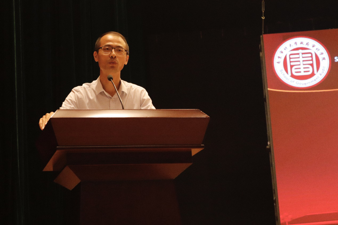 政府审计学院党总支书记祝遵宏教授致欢迎词。为了新生能够更好地适应未来南审的学习生活,书记提出了几点希望和要求:一是切实注重安全,尤其是财务和人身安全;二是遵守校规校纪;三是尽早做好职业生涯规划。