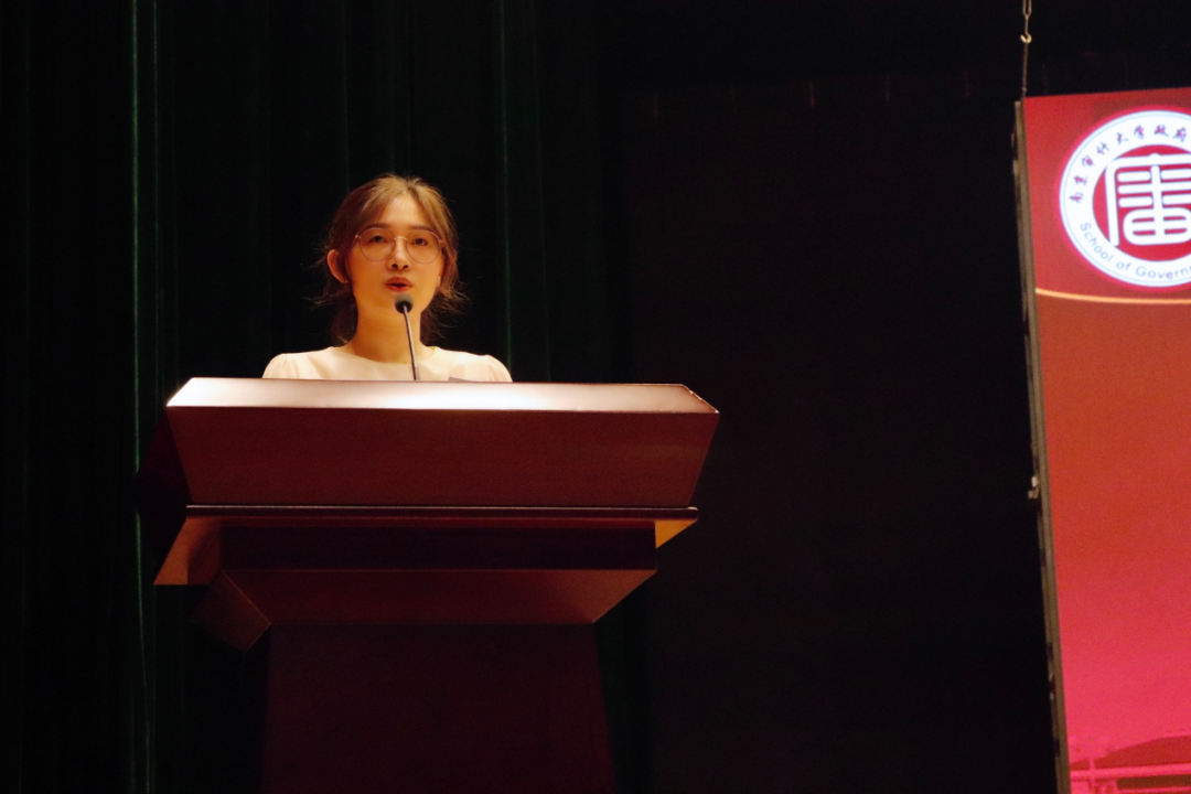 郑玮同学代表研究生新生发言。这是郑玮第二次选择了政府审计学院,本科四年的学习使她对审计这条道路愈发坚定。在全球抗击疫情的大背景下,郑玮同学也以审计人的视角对一些现象进行了深入地思考。她希望同学们都能肩负起青年人的责任,为国家的审计事业贡献自己的力量。