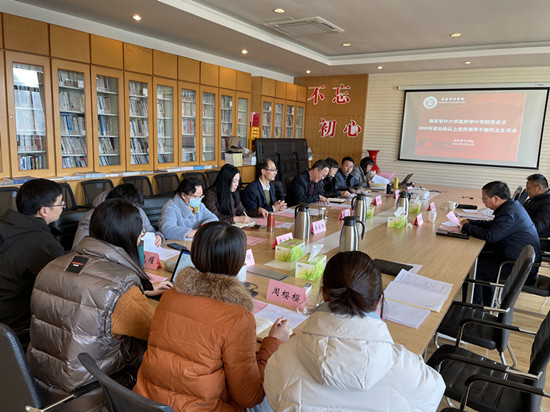 2021年1月13日下午2点,政府审计学院党总支处级以上党员领导干部2020年度民主生活会在敏行楼四楼会议室召开,校党委副书记、副校长王会金出席会议,校纪委委员、校督导组成员张勇,学院处级党员领导干部祝遵宏、郑石桥参加了会议,政府审计学院执行院长陈骏,副院长王士红、李兆东,国家审计研究院执行院长王素梅列席民主生活会。