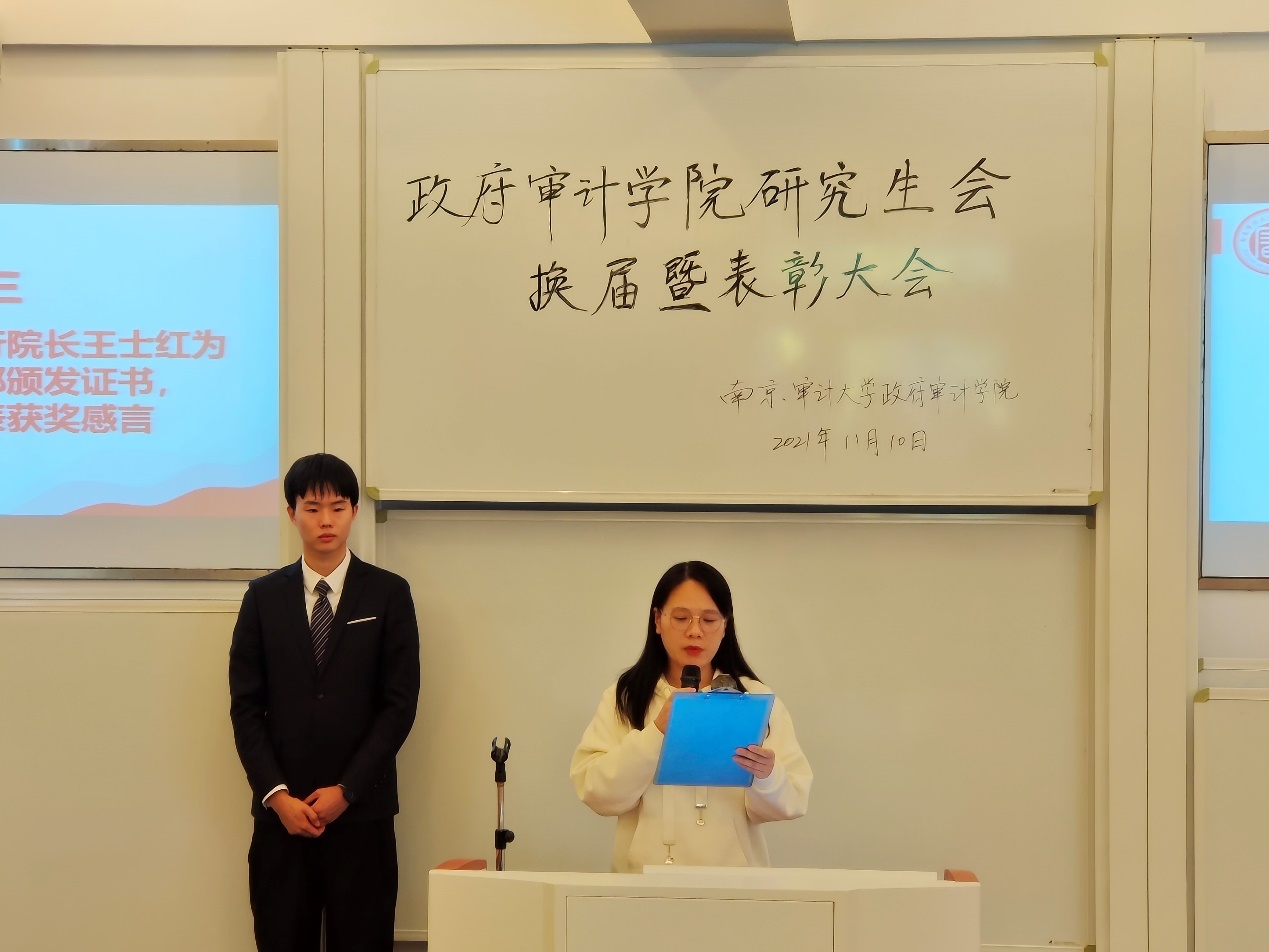 本次换届表彰大会由第四届政府审计学院研究生会文体部部长助理周为主持。