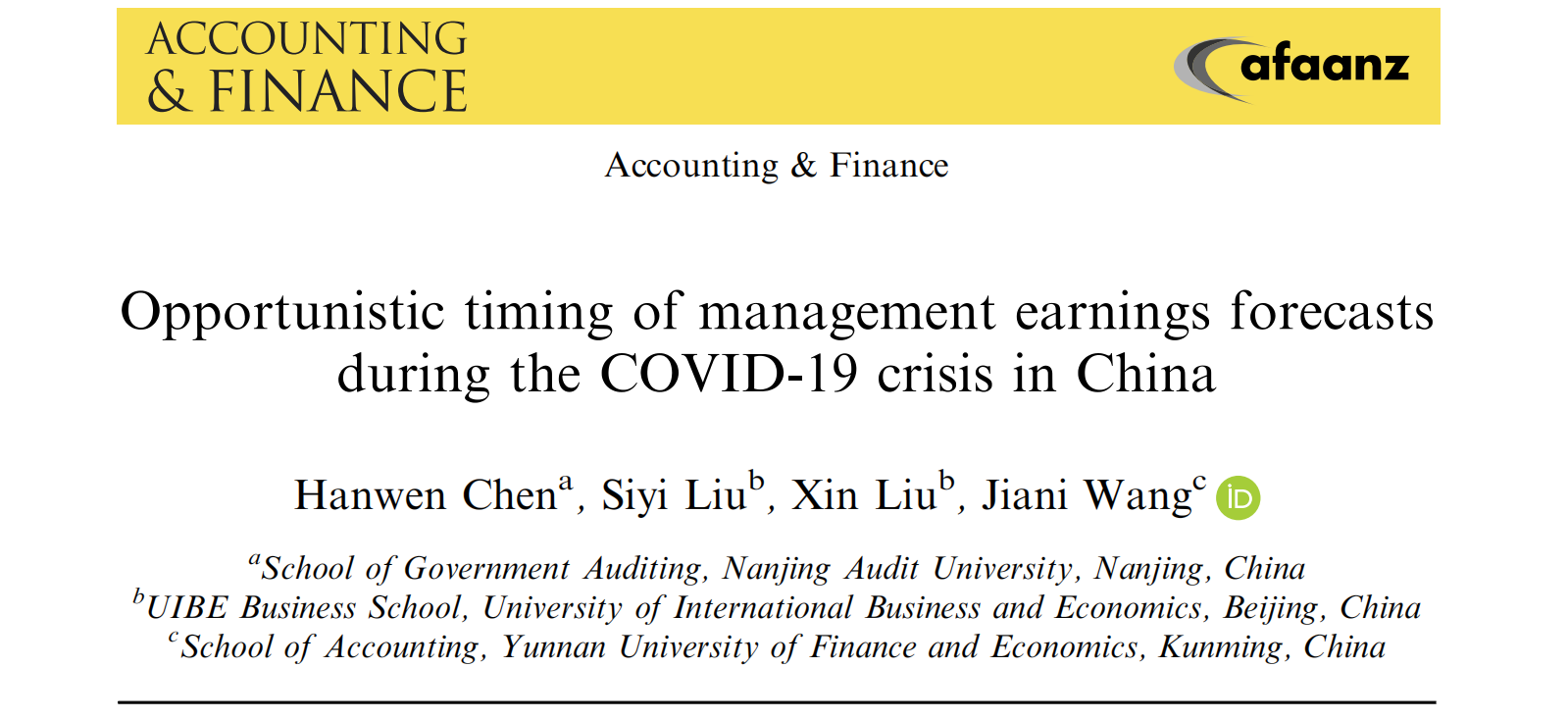 陈汉文教授的合作术论文“Opportunistic timing of management earnings forecasts during the COVID-19 crisis in China”也于近期被国际知名会计学术期刊Accounting and Finance接受并在线发表。Accounting and Finance创刊于1979年,是澳洲会计与金融学会旗下期刊,系JCR商学与财务学二区,近5年影响因子为3.27,在国际金融和会计学术界、实务界具有一定影响力。