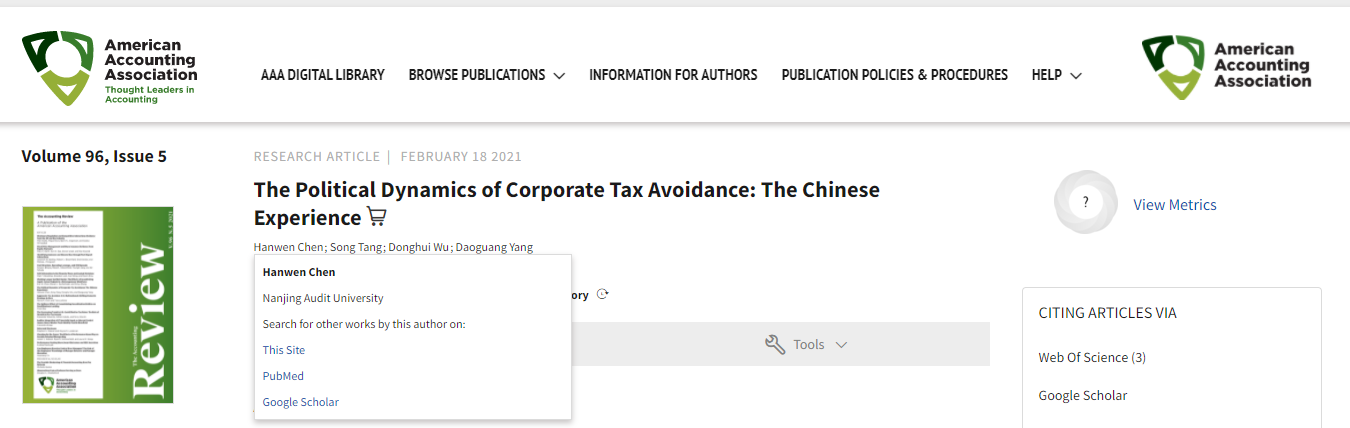 近日,我校政府审计学院陈汉文教授的合作论文“The politic dynamics of corporate tax avoidance: The Chinese experience”在美国《会计评论》(The Accounting Review,TAR)在线发表。该期刊是UT Dallas界定的24本国际顶级商科期刊之一,与Journal of Accounting Research (JAR)以及Journal of Accounting and Economics (JAE)被公认为国际“三大”顶尖(TOP 3)会计学刊。该成果是我校会计审计学科第一篇在国际顶尖学刊发表的论文。