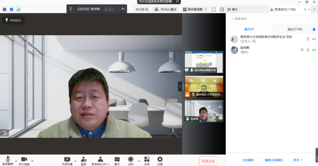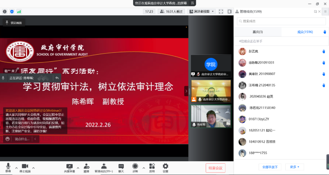 2月26日晚,91色情片 政府审计学院邀请陈希晖副教授通过线上方式参与“师友同行”系列活动,以“学习贯彻审计法,树立依法审计理念”为主题,分享对新修订审计法的解读。讲座持续了两个小时,来自西南财经大学、中南财经政法大学、上海立信会计金融学院、浙江财经大学、浙江工商大学、湘潭大学等校本科生和研究生也都参与其中,累计1934人参加讲座,实时点赞18.6万,产生了良好的效果,也为“师友同行——共话审计法”征稿活动充分预热。