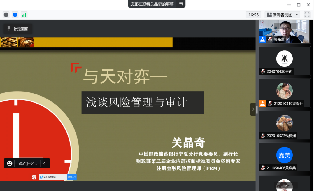 327日下午,政府审计学院在线上举行“师友同行”系列讲座——风险管理与审计。本次讲座邀请中国邮政储蓄银行关晶奇先生主讲,政府审计学院执行院长王士红教授主持,学院300多名师生在线聆听讲座。