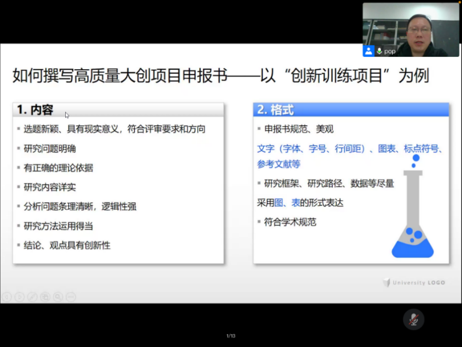 讲座围绕大学生创新创业训练计划的内涵和意义、大创项目申报程序和遴选规则、如何撰写高质量大创项目申报书三大部分展开。