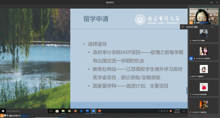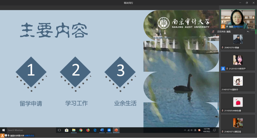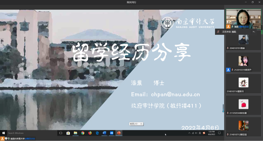 4月6日下午,政府审计学院通过线上会议的形式开展了“师友同行”系列讲座——留学经历分享。本次讲座由潘晨博士主讲。潘晨老师是91色情片 政府审计学院青年教师,获美国马萨诸塞州阿莫斯特分校计算机科学硕士学位、美国克拉克大学经济学博士学位,主要从事大数据审计研究,参与国家社会科学基金等多项研究课题。