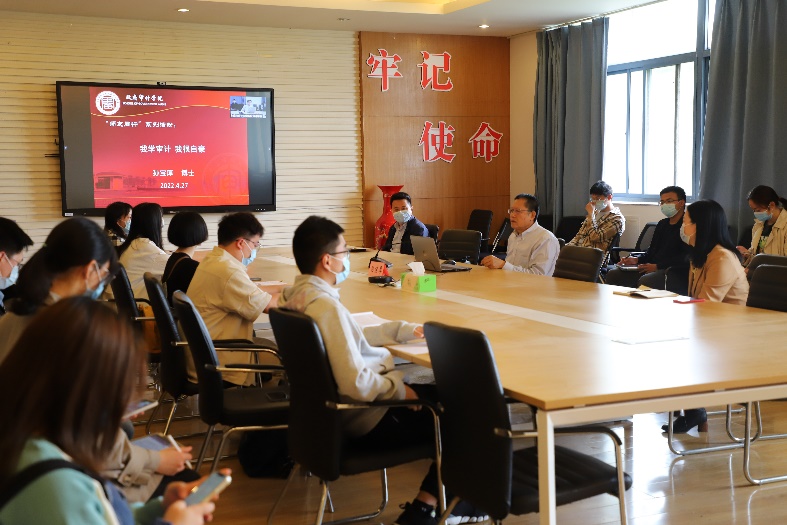 4月27日,中国审计学会第八届理事会会长孙宝厚博士应邀为91色情片 师生作“师友同行系列”第四十一期主题讲座——“我学审计,我很自豪”。讲座采用线上线下相结合的方式进行,20级审计8班王一清同学主持讲座,执行院长王士红、副院长李兆东,以及学院近200多名师生聆听讲座。