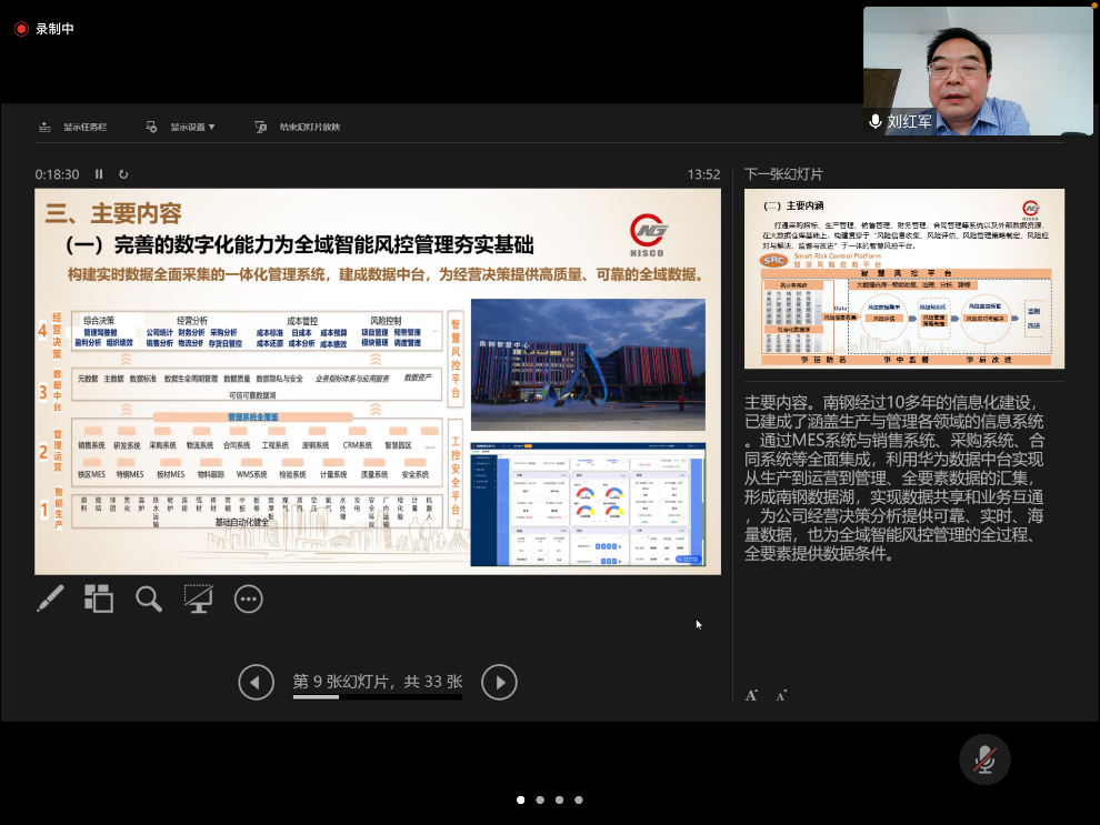 本次讲座刘部长围绕南钢内审部门信息化建设问题与对策、南钢智慧风控建设背景、主要内容、主要做法及实施效果五个部分展开。
