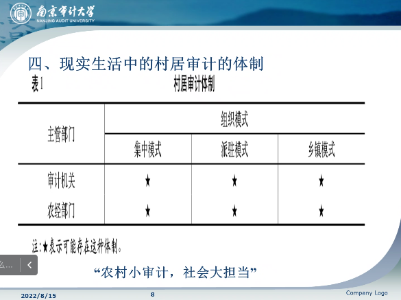 为了完善村居审计制度,促进村居审计制度高质量发展,郑石桥抛出了村居审计要研究的学术问题,包括村居审计的性质、村居审计制度、村居领导干部经济责任审计、村居审计准则等。其中在村居审计的性质问题上,重点讨论了村居审计属于内部审计村居审计属于国家审计村居审计属于一种特殊类型的审计三个观点,而这个问题对于后续审计的开展至关重要。同时也指出,目前村居审计基本理论等仍然需要进一步研究。