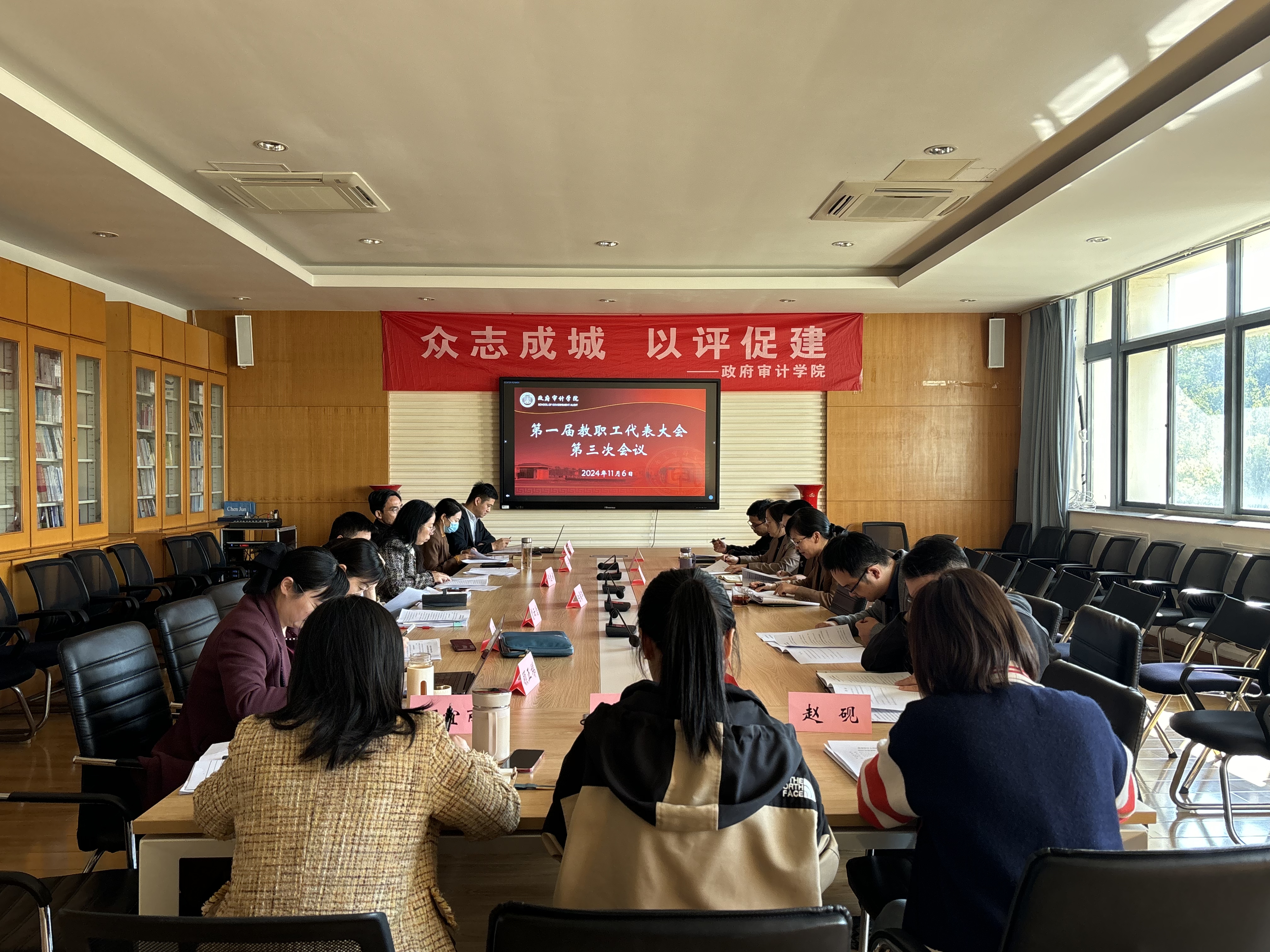 11月6日下午,政府审计学院在敏行四楼会议室召开第一届教职工代表大会第三次会议。学院党政班子、教职工代表参加会议。会议由学院党委书记李海燕主持。